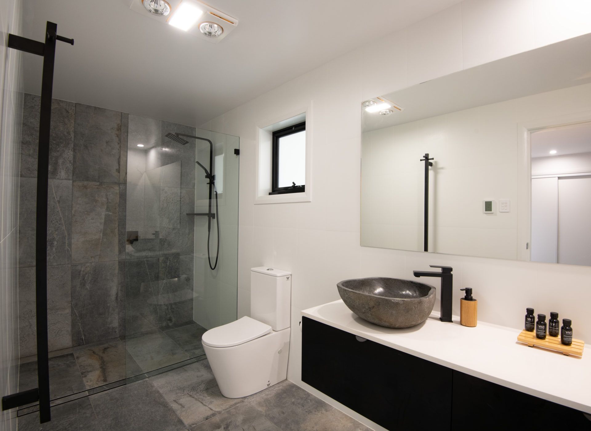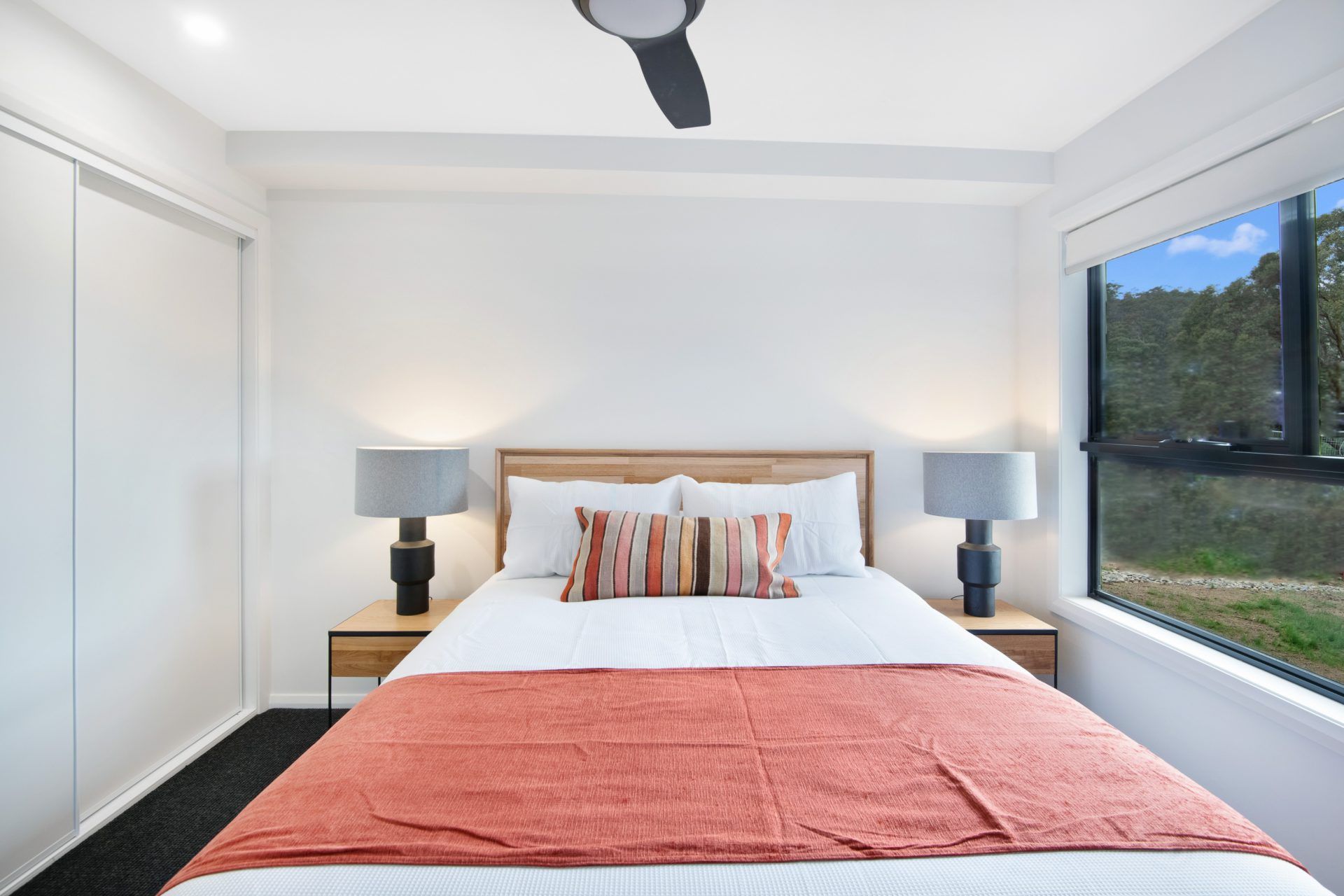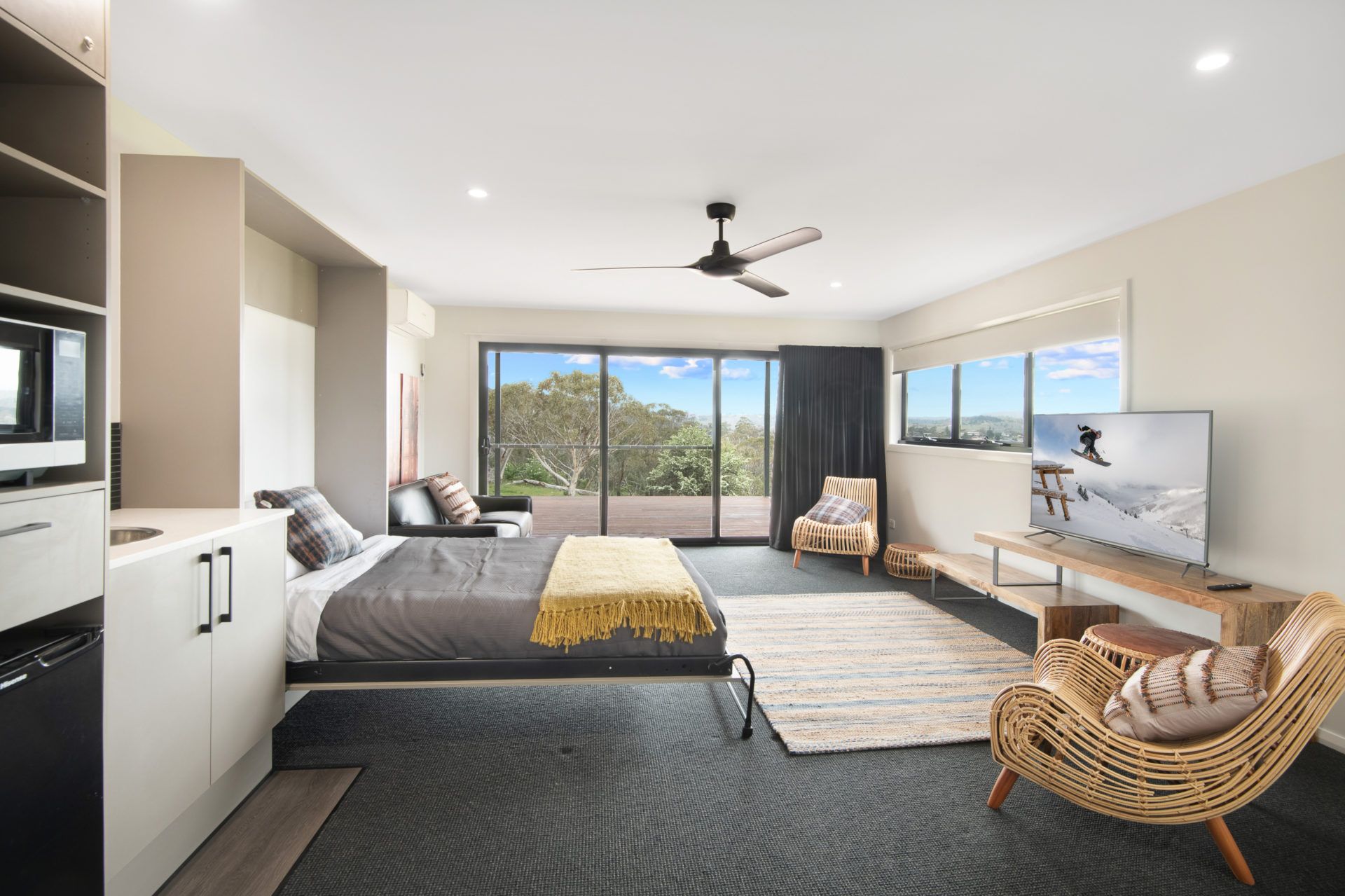 Descending to the ground level, you'll find a second living space featuring kitchenette facilities and a convenient pull-down Murphy bed with a comfortable queen size innerspring mattress. Bedroom 2 offers a queen-size bed with a built-in robe and panel heater, while Bedroom 3 features two king single beds, also with built-in robes and panel heaters. The main bathroom on the ground level indulges you with floor heating, a freestanding bath, a spacious shower, and a vanity, as well as a toilet.