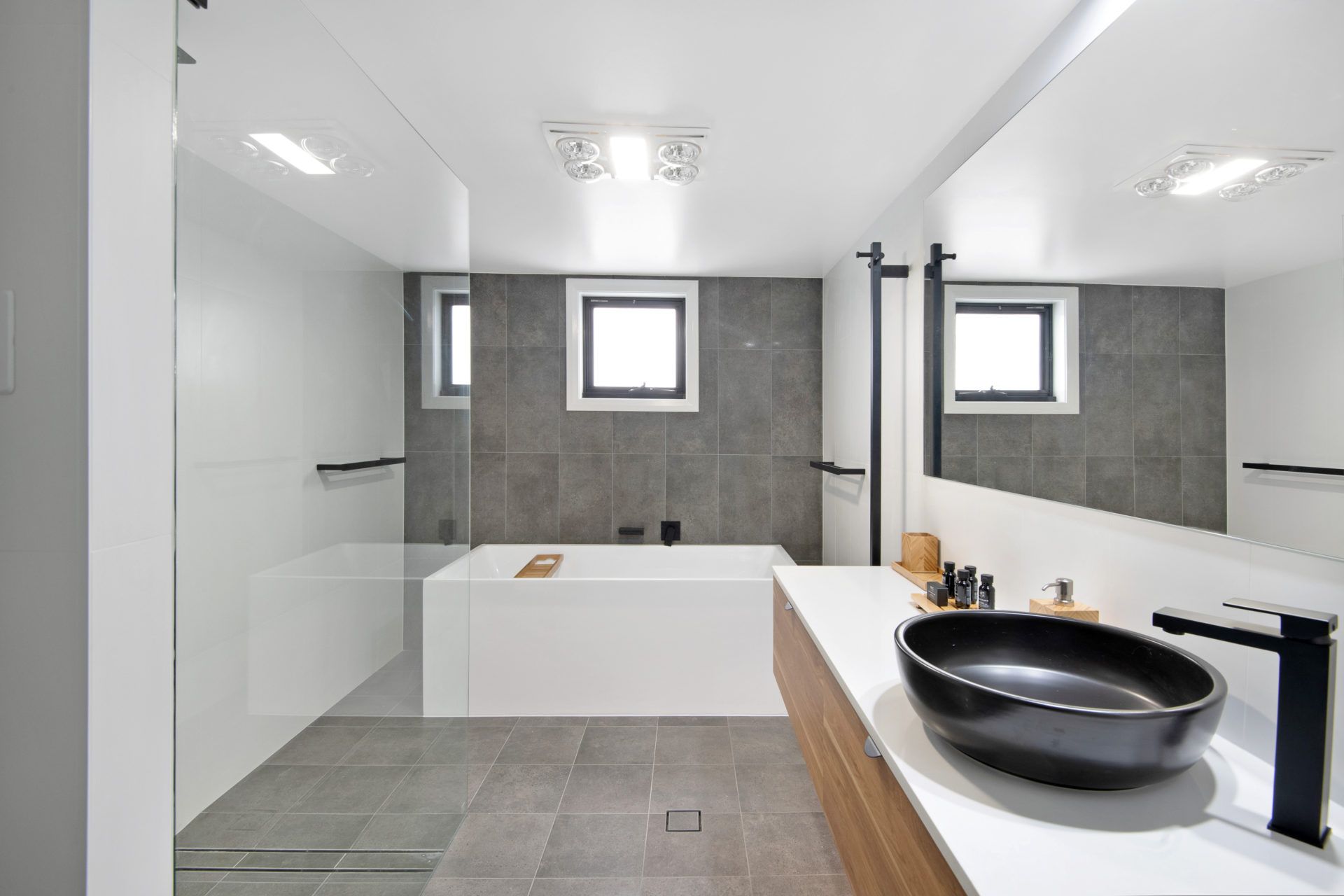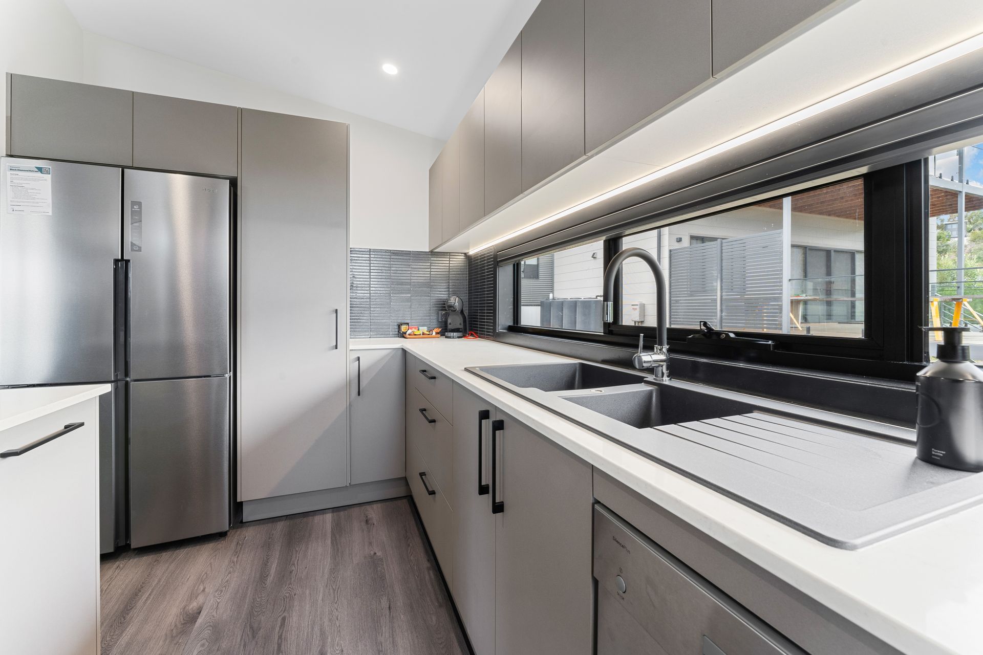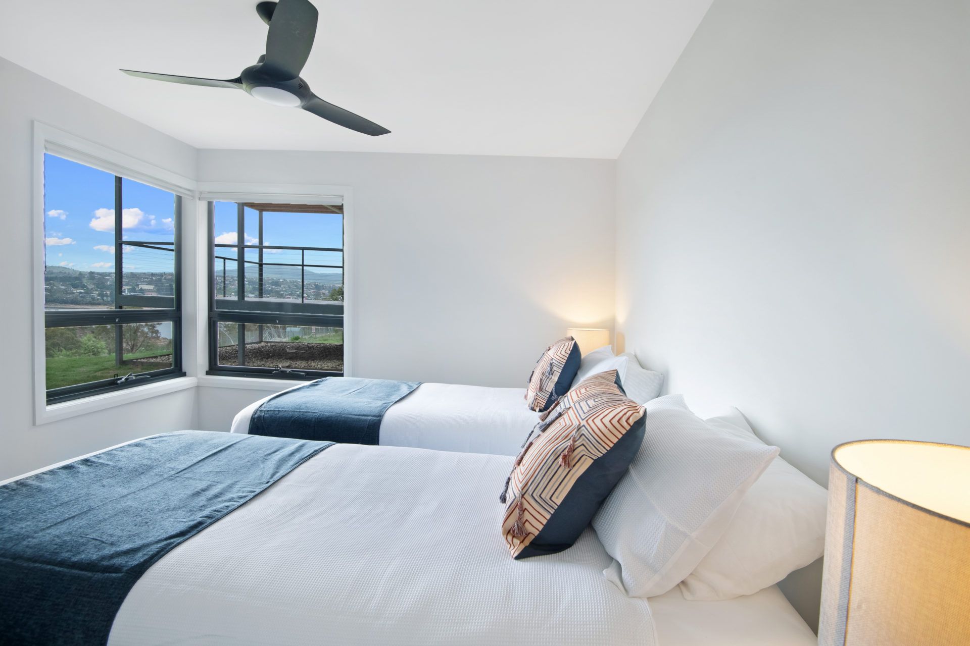 Descending to the ground level, you'll find a second living space featuring kitchenette facilities and a convenient pull-down Murphy bed with a comfortable queen size innerspring mattress. Bedroom 2 offers a queen-size bed with a built-in robe and panel heater, while Bedroom 3 features two king single beds, also with built-in robes and panel heaters. The main bathroom on the ground level indulges you with floor heating, a freestanding bath, a spacious shower, and a vanity, as well as a toilet.