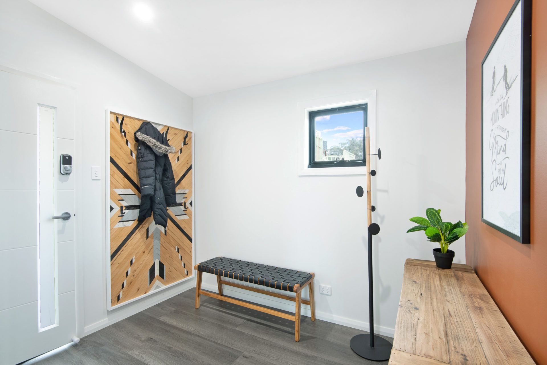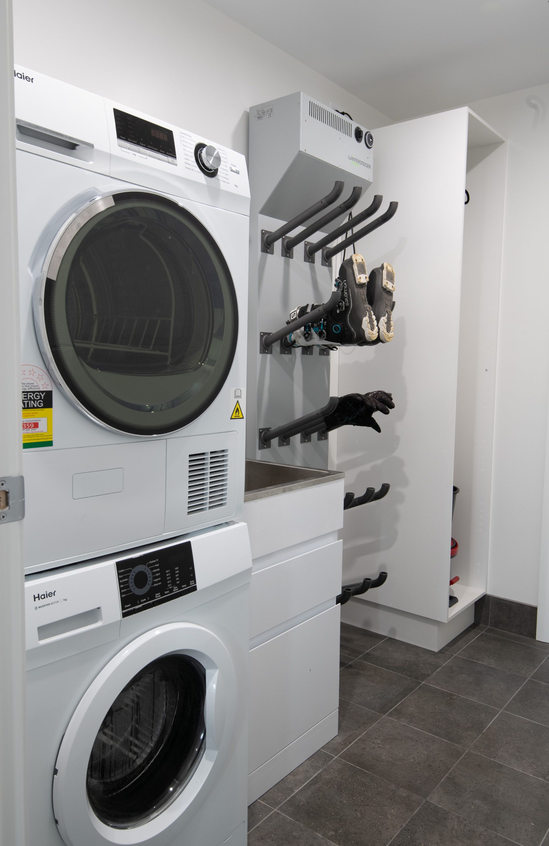 As you arrive, you'll be greeted by a spacious double carport and a charming mudroom, featuring a stunning barn door entrance. Step inside to discover a beautifully designed living area that exudes warmth and style. On the entry level, you'll find a well-appointed laundry room with floor heating, complete with a washer, dryer, and a specialized ski boot drying stand, ensuring your gear is ready for exciting days on the slopes. Adjacent to the laundry room, a convenient powder room is available for the lounge and kitchen area.