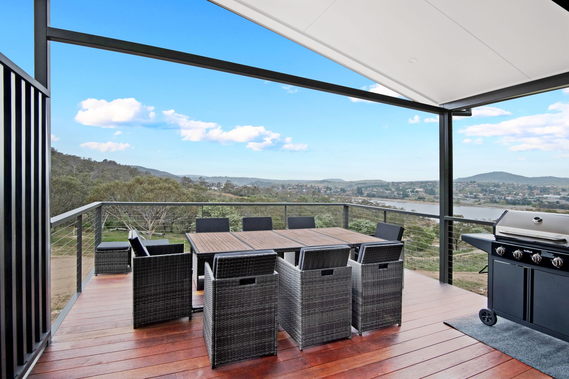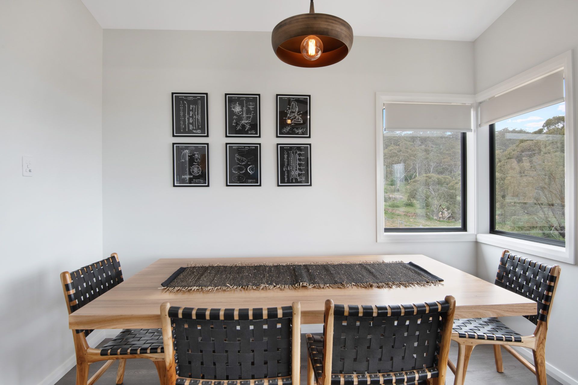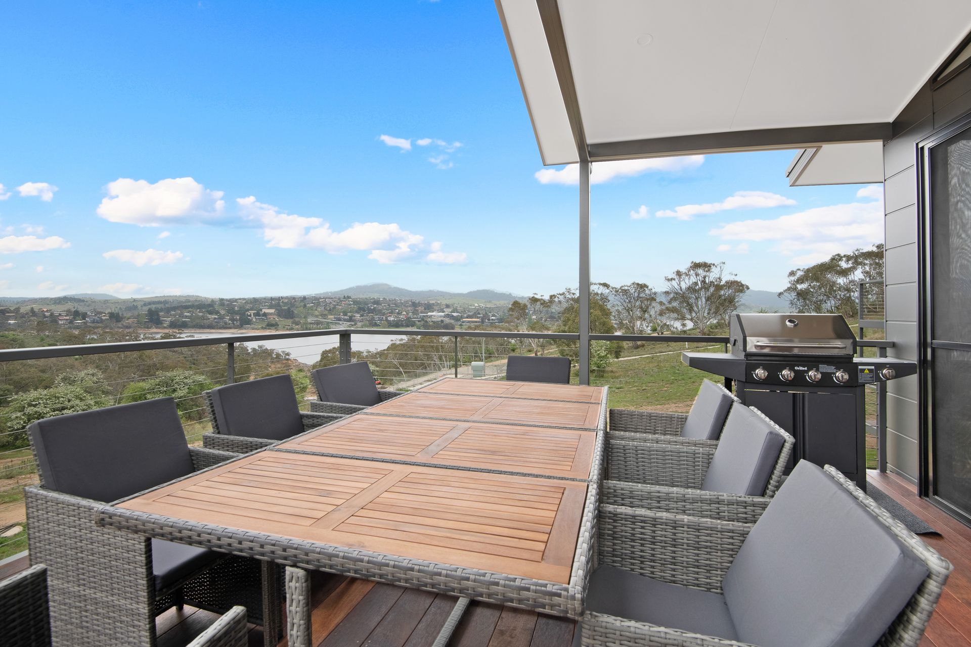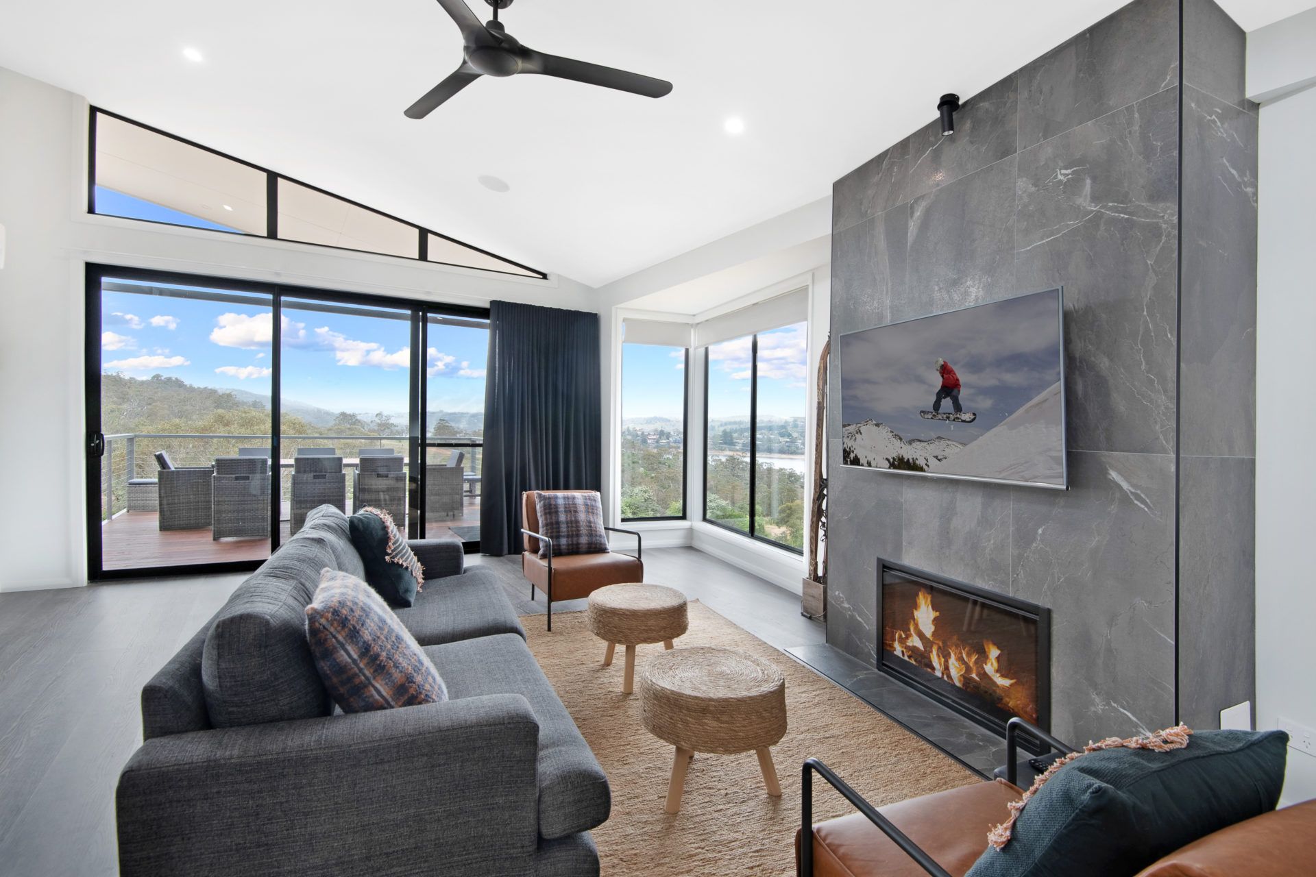 The living and dining area provides the perfect space to unwind in any season. Stay cozy with the reverse cycle air conditioner and gas fireplace, while enjoying your favorite shows on the smart TV. During dinner, connect your device to the Bluetooth speakers in the ceiling and set the mood with your favorite playlist. Step outside to the expansive covered deck, offering a breathtaking backdrop of the lake. Relax in the comfortable outdoor setting or fire up the hooded BBQ for a delicious feast.