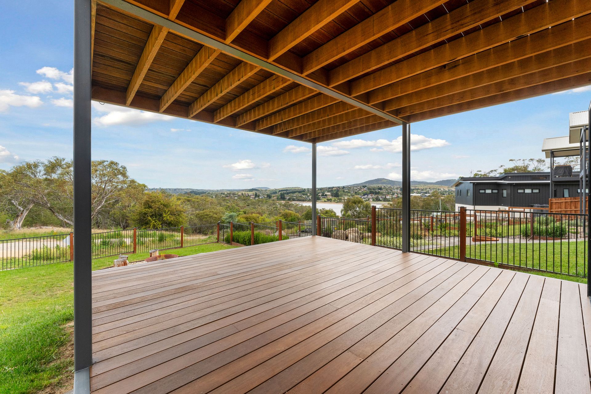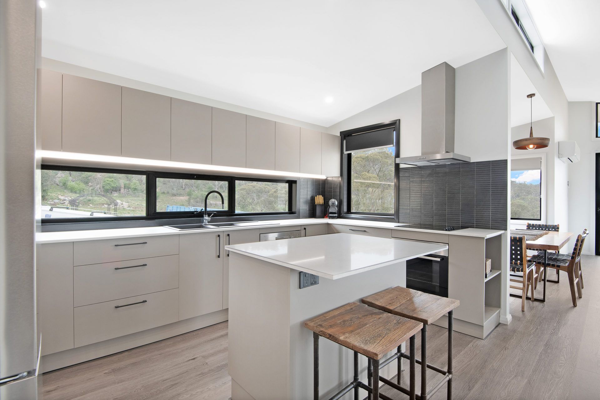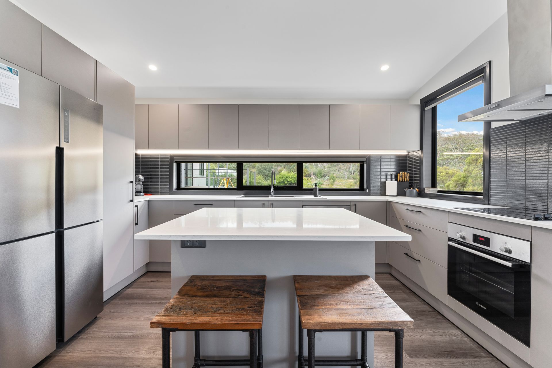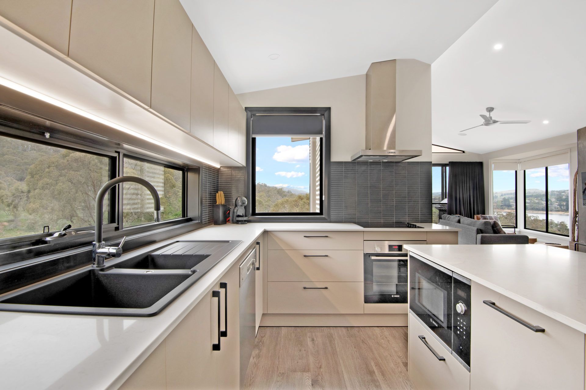 The living and dining area provides the perfect space to unwind in any season. Stay cozy with the reverse cycle air conditioner and gas fireplace, while enjoying your favorite shows on the smart TV. During dinner, connect your device to the Bluetooth speakers in the ceiling and set the mood with your favorite playlist. Step outside to the expansive covered deck, offering a breathtaking backdrop of the lake. Relax in the comfortable outdoor setting or fire up the hooded BBQ for a delicious feast.
