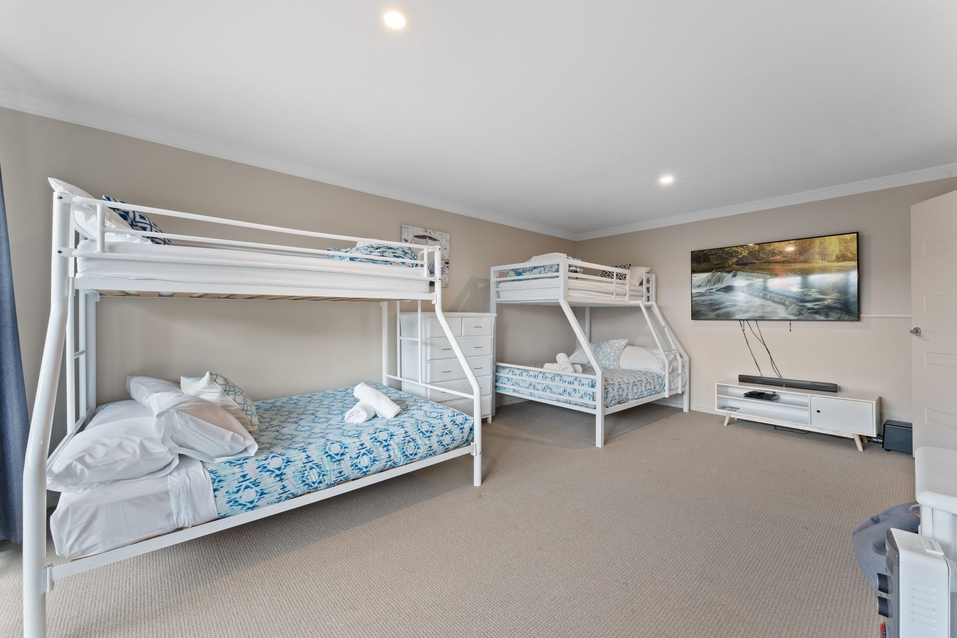 Downstairs, you will find the third bedroom, which features two tri-bunks and an ensuite bathroom. This bedroom also has a 64" flat screen TV and electric heating, making it a great space for kids or teenagers to hang out.