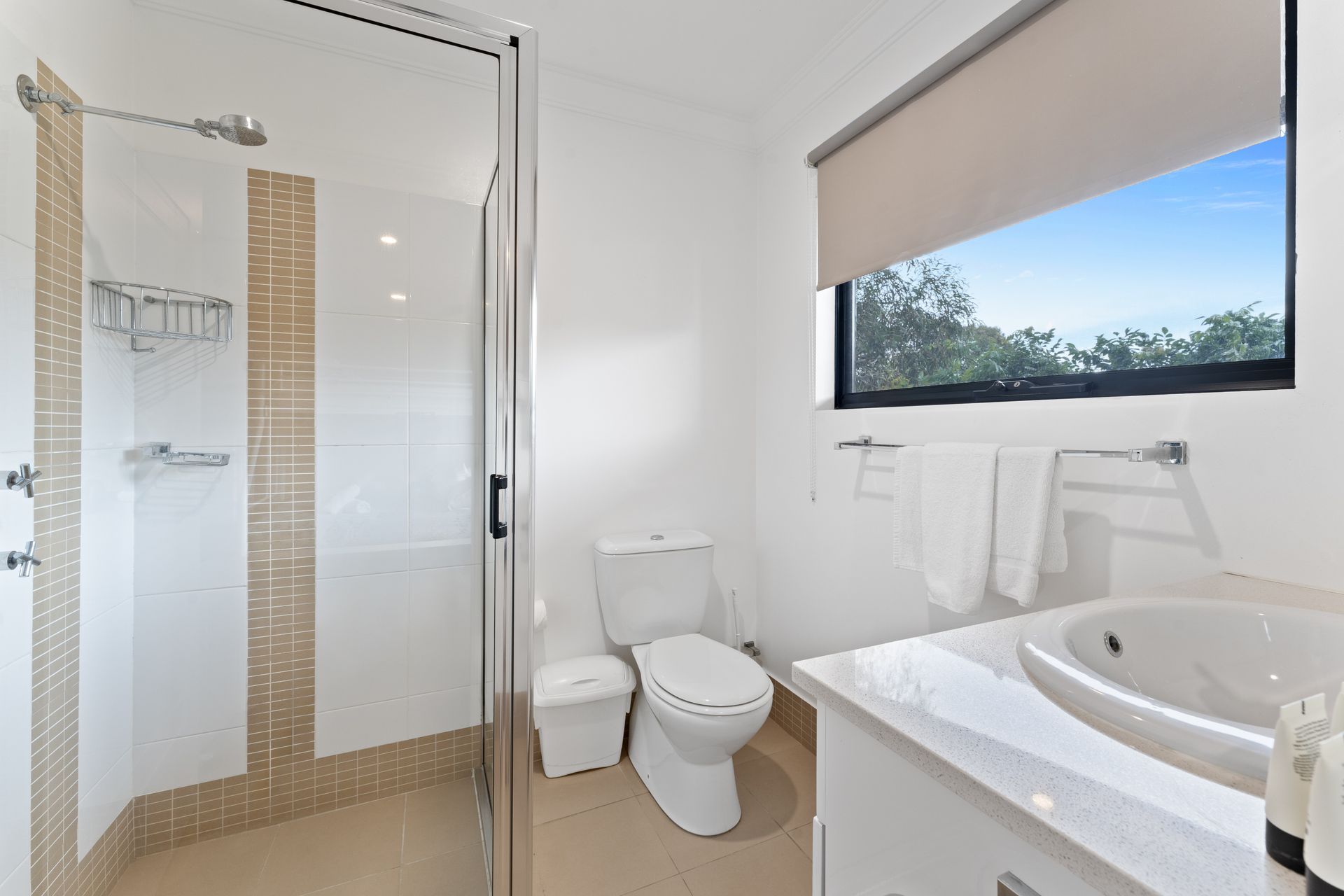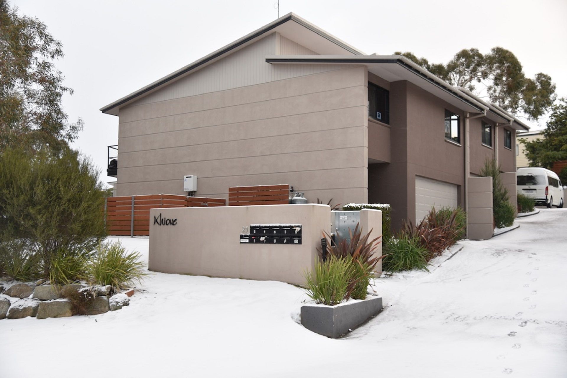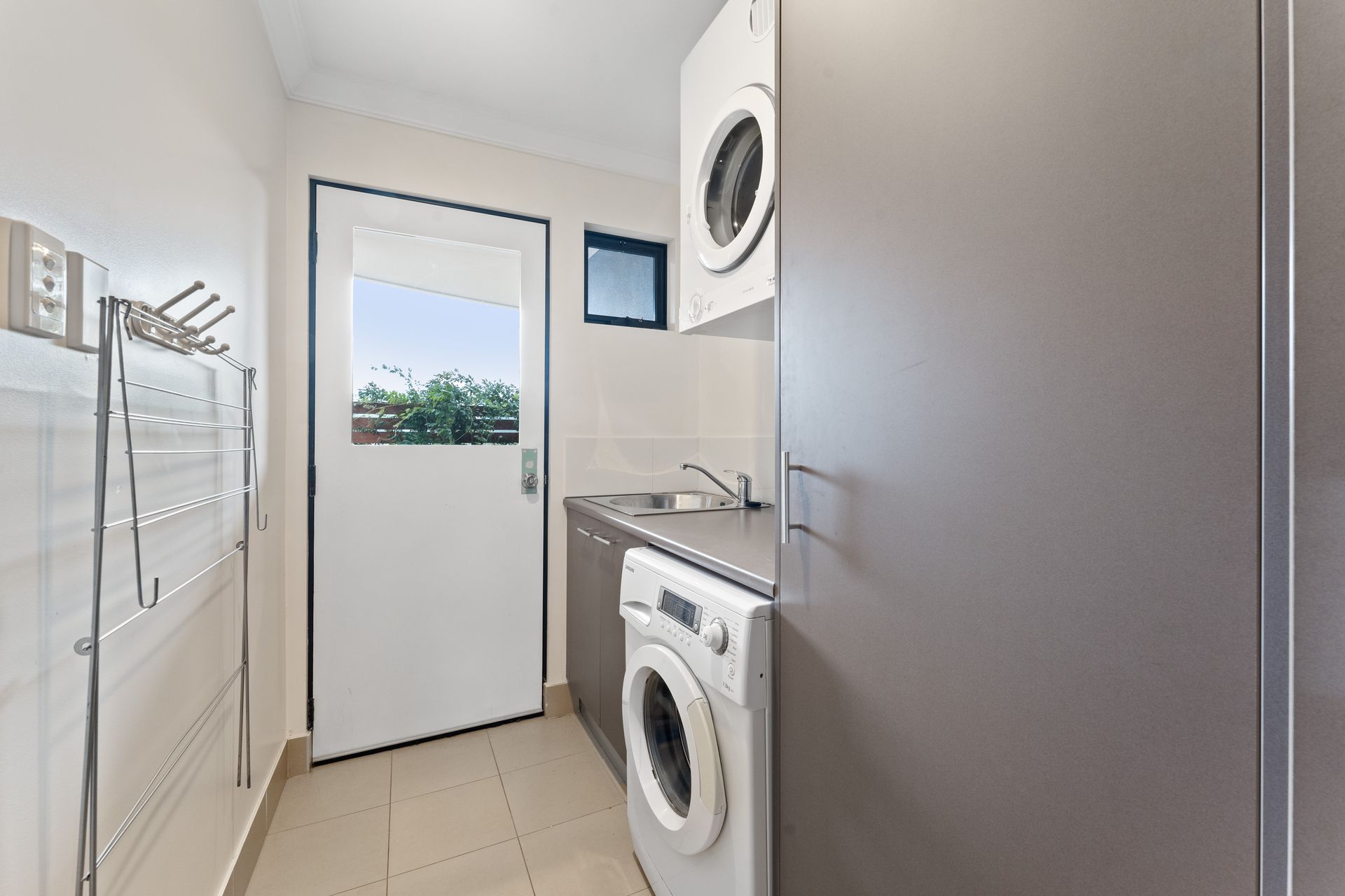 The laundry provides a washer and dryer, with an external door to the private courtyard and plenty of additional storage space. Khione 1 also has a double lock-up garage with remote, a drying room with hanging space, and internal access to the townhouse.