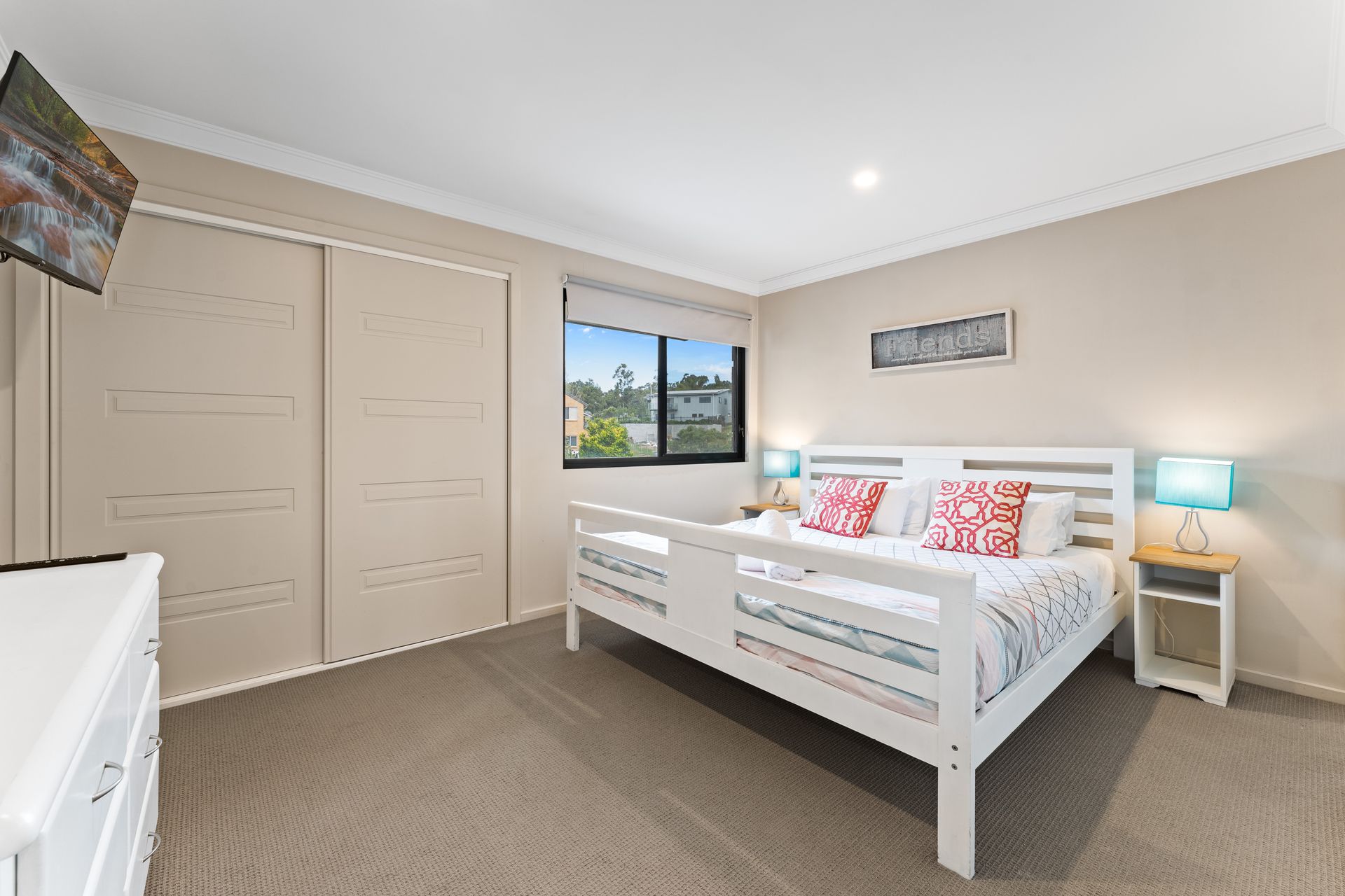 The lounge area is designed for relaxation, with a 60" Smart HD TV, Wifi, soundbar and gas heating to ensure your comfort. There are also two bedrooms on the upper level, one with an ensuite, a main bathroom with a spa bath, and a writing nook for those who need to catch up on some work.