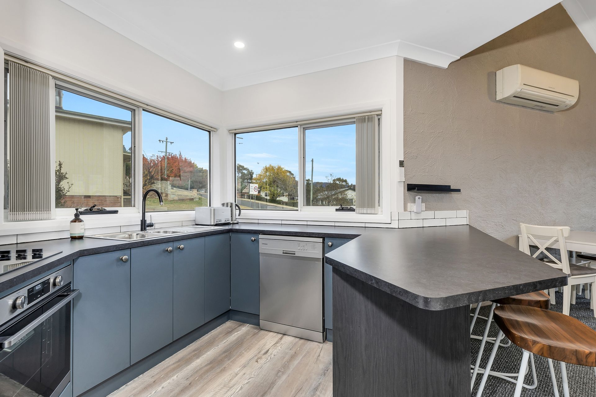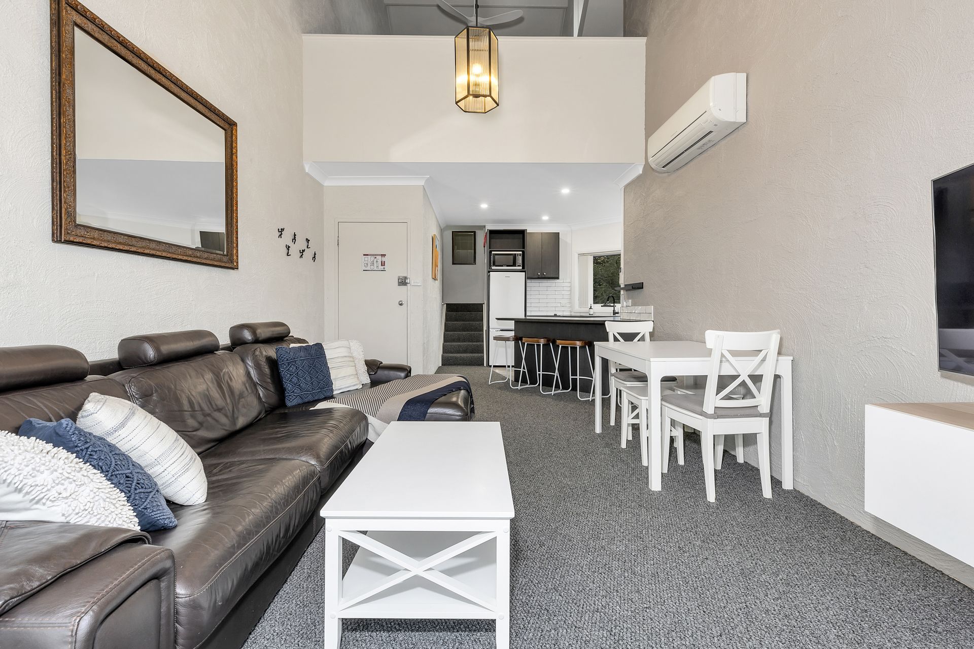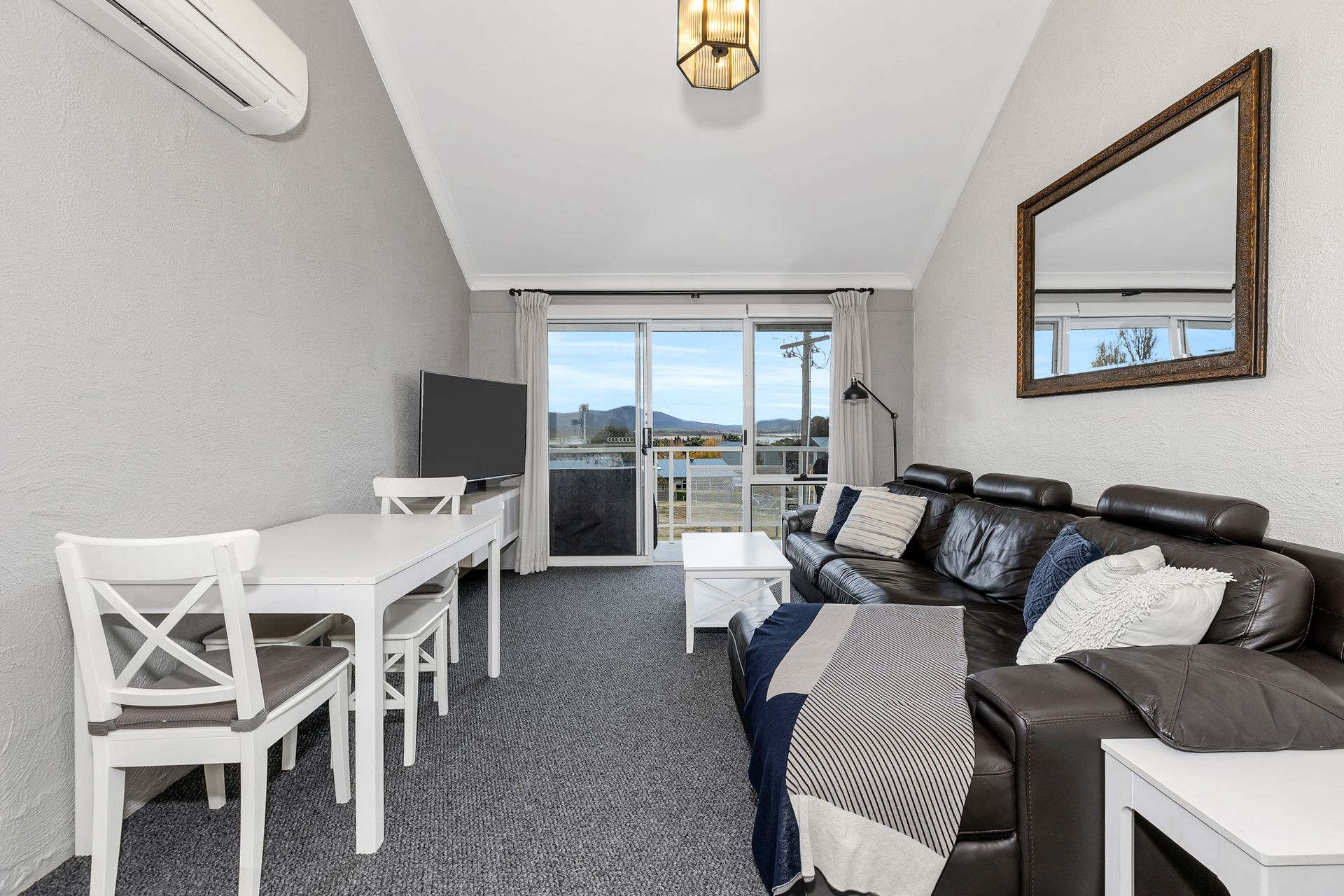 On the first level, you'll find a spacious open-plan living and dining area, featuring reverse cycle air conditioning for year-round comfort. Relax with the Smart TV or prepare meals in the brand-new, fully equipped kitchen, ideal for entertaining family and friends. Step out onto the private balcony, complete with a Weber BBQ—perfect for summer dining while taking in the scenic mountain views.