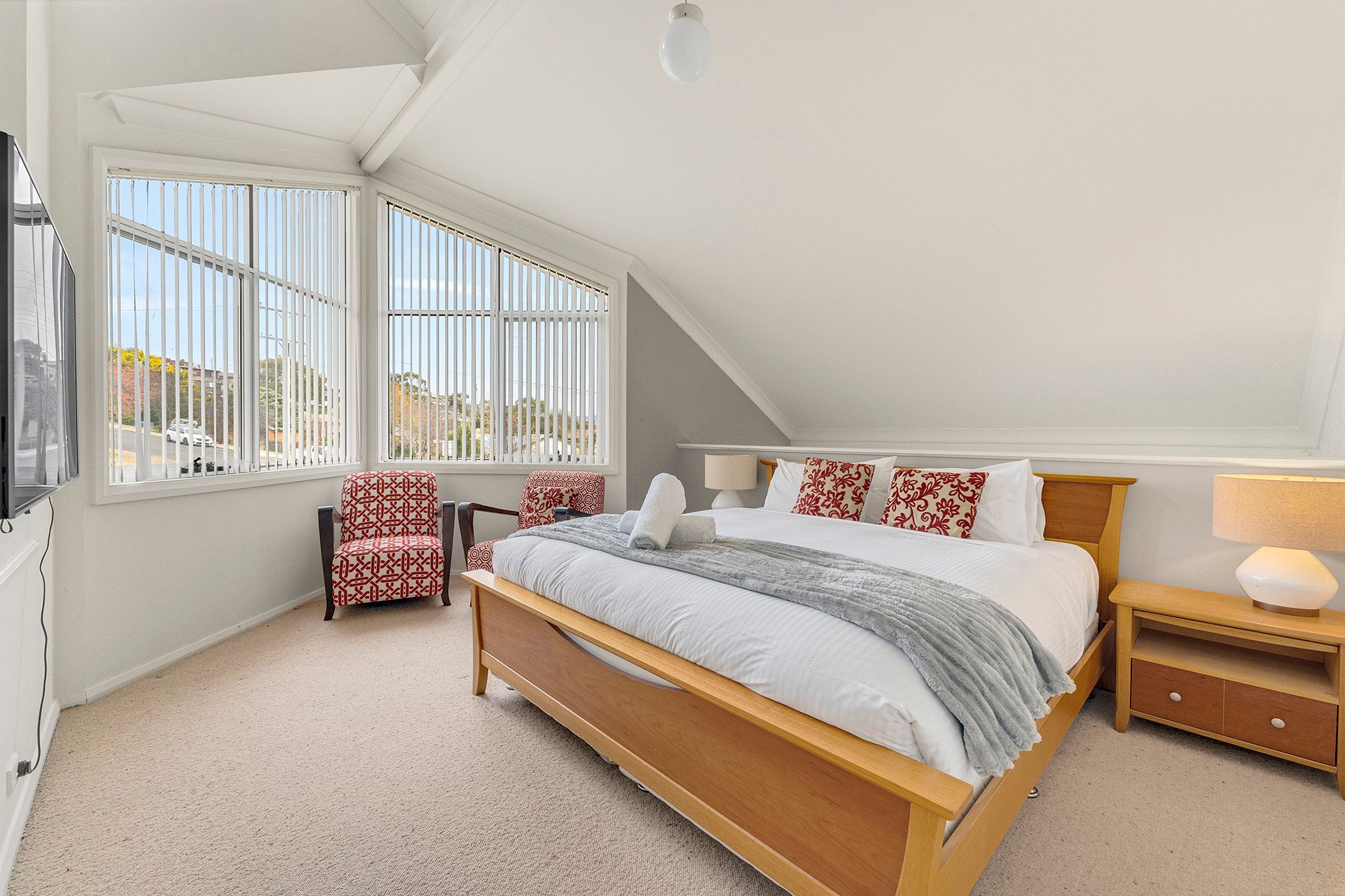 On the top level, the loft-style main bedroom offers a peaceful retreat with a luxurious King-size bed, Smart TV, built-in cupboard, and a private ensuite bathroom with corner spa and shower—an ideal way to unwind after a day of alpine adventure.